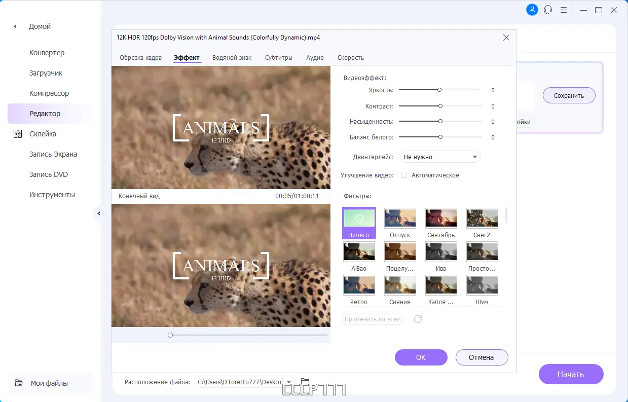 - Редактирование видео: обрезка, объединение, настройка цвета и эффектов
