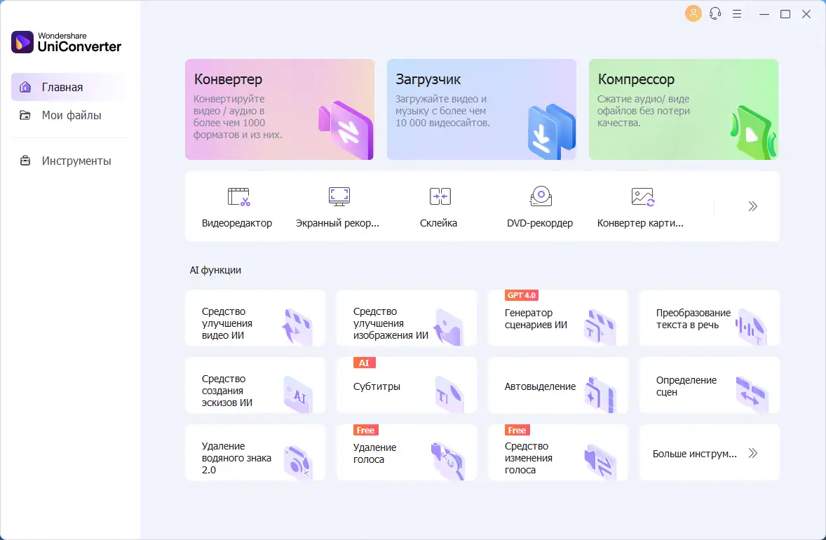 Wondershare UniConverter — универсальный инструмент для конвертации, редактирования и управления видеофайлами в более чем 159 форматах. Поддержка 4K, аппаратное ускорение и функции ИИ позволяют обрабатывать контент быстро и с высоким качеством. Программа подходит для работы с мультимедиа на разных устройствах, включая смартфоны, планшеты и игровые консоли.