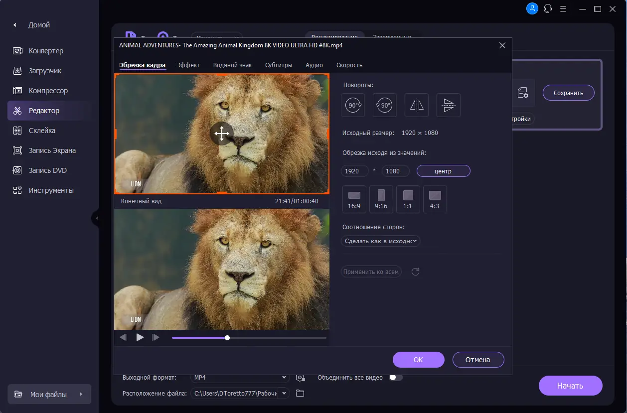 - Редактирование контента: обрезка, объединение, настройка цвета, добавление водяных знаков и субтитров