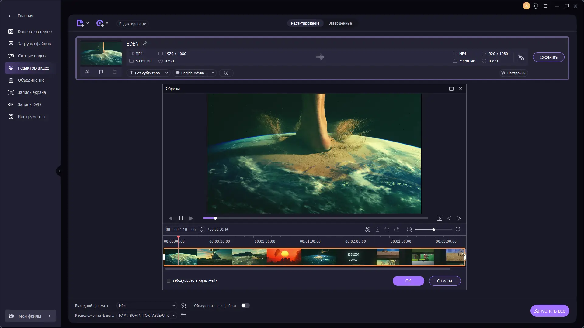 - Редактирование: обрезка, объединение, наложение водяных знаков, настройка цветокоррекции
