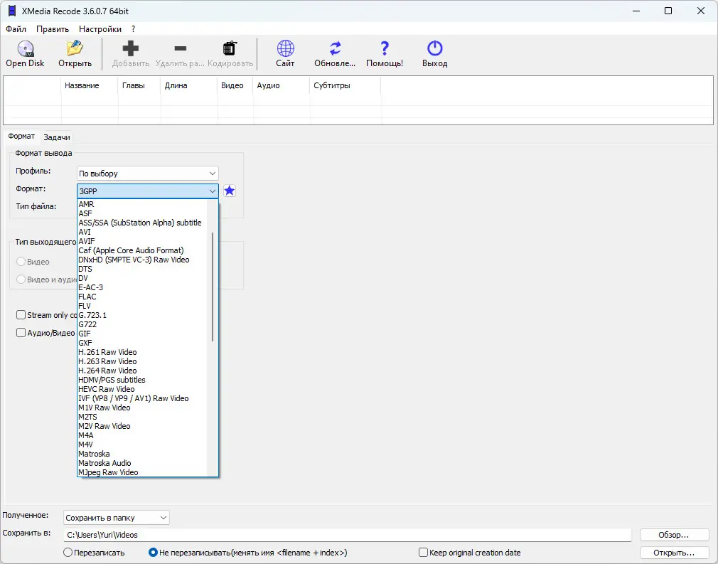 XMedia Recode — это универсальный конвертер, ориентированный на широкий спектр пользователей, от домашних до профессиональных. Программа поддерживает огромное количество видео- и аудиоформатов, позволяя легко адаптировать контент под конкретное устройство. Она работает с такими форматами, как AVI, MP4, MKV, FLV, MOV, а также аудио в виде MP3, WAV, FLAC и других.