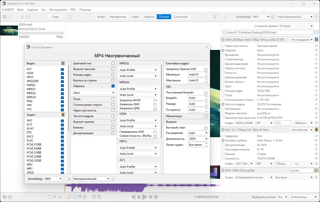- Возможность тонкой настройки потоков, метаданных, фильтров и параметров кодирования через единую панель управления.