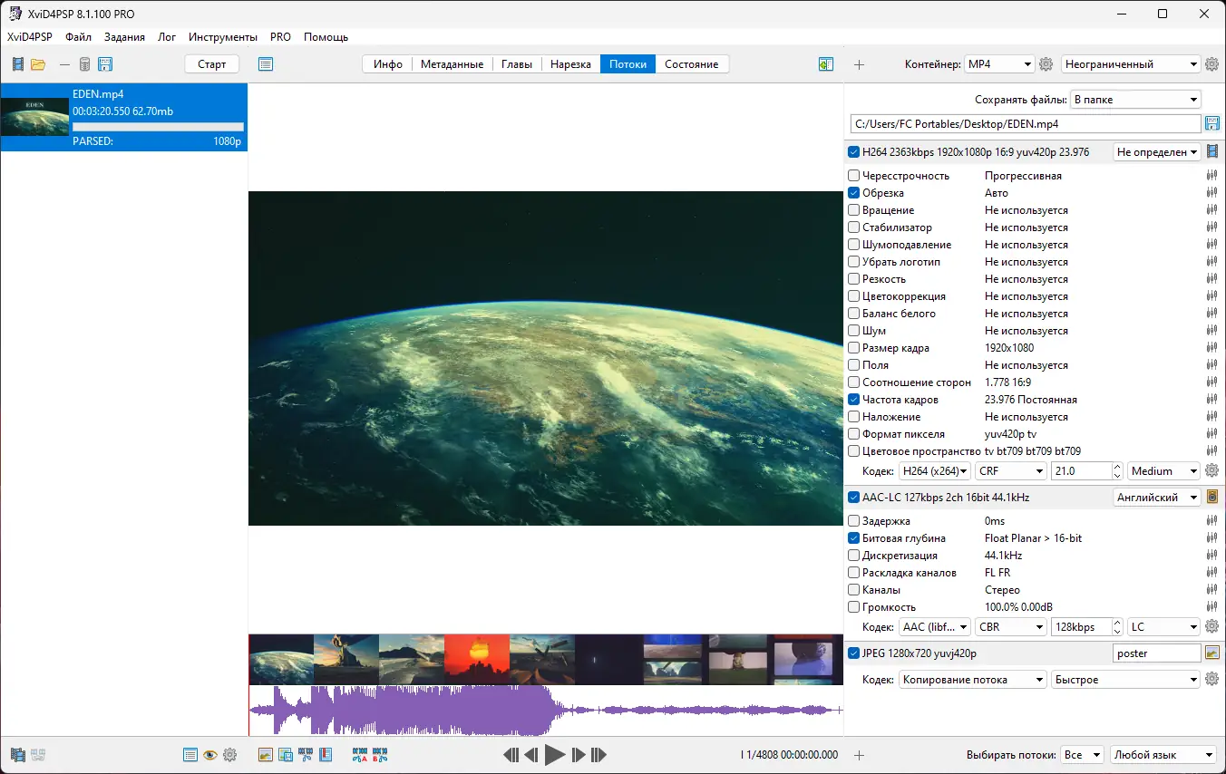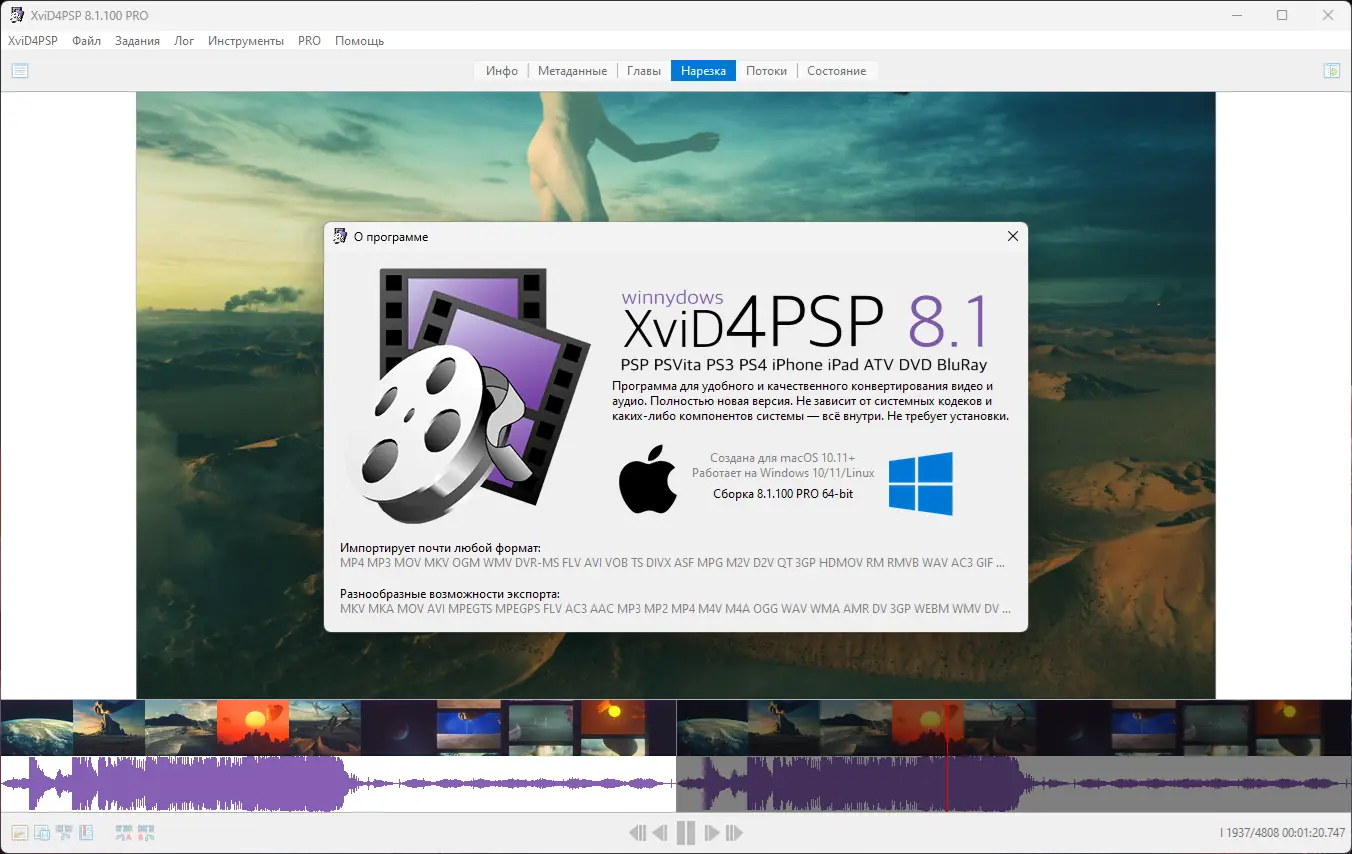 XviD4PSP — это мощный универсальный конвертер аудио и видео, поддерживающий широкий спектр форматов и ориентированный на высокую производительность, гибкость настроек и совместимость с различными устройствами. Программа не зависит от внешних кодеков и системных компонентов, что делает её особенно удобной для использования на разных компьютерах. Она поддерживает пакетную обработку, аппаратное ускорение и точную настройку параметров кодирования, включая работу с HDR и современными видеостандартами.