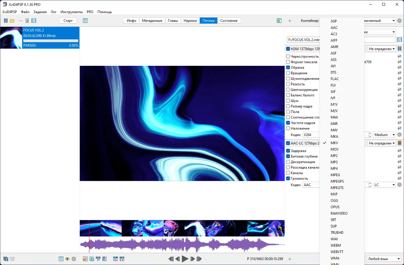 - Поддержка широкого спектра медиаконтейнеров и кодеков на входе и выходе