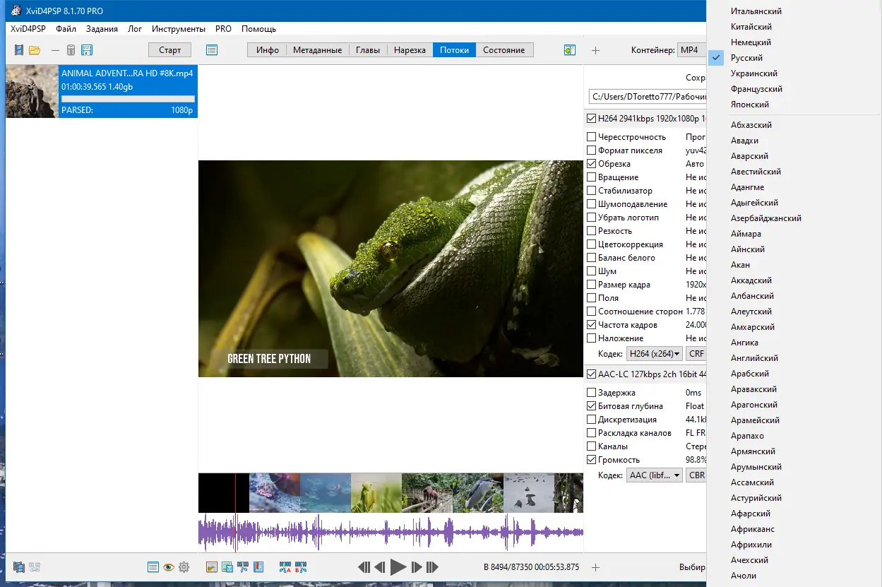 - Поддержка аппаратного декодирования и кодирования, включая AV1, H.265 и VFR, что существенно ускоряет обработку.