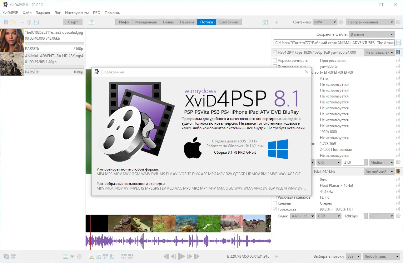 XviD4PSP представляет собой многофункциональное приложение для конвертации аудио и видео, способное обрабатывать десятки форматов без зависимости от установленных в системе кодеков. Версия 8.1 pro была существенно переработана по сравнению с предыдущими релизами: интерфейс стал быстрее, добавлена поддержка работы в тёмной теме macOS, улучшена производительность при работе с большими файлами. Особое внимание уделено портативности и кроссплатформенности — теперь программа доступна не только на Windows и macOS, но и на Linux.