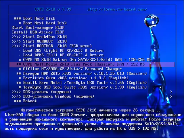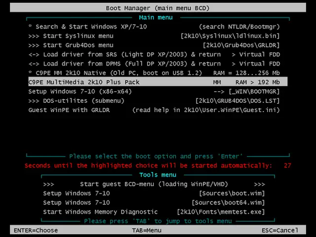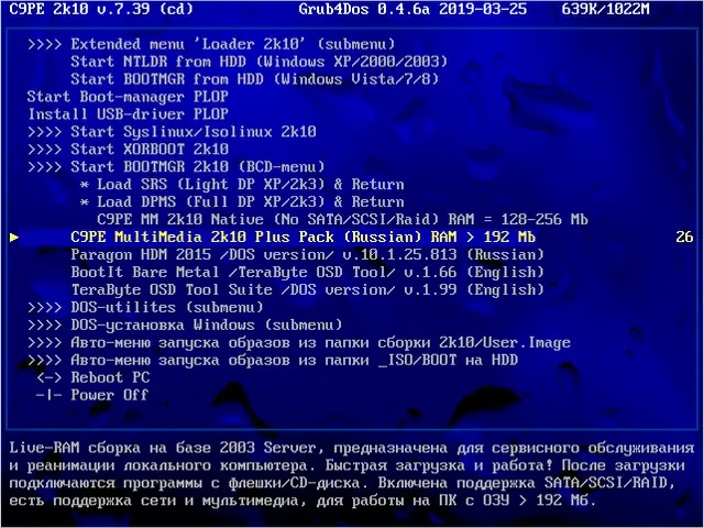 C9PE представляет собой специализированный загрузочный комплекс, ориентированный на профессиональное использование в условиях, когда основная операционная система не запускается или требует срочного вмешательства. Основа диска — гибридная архитектура, использующая BOOTMGR (Windows 8.1), Isolinux/Syslinux v.4.06 и Grub4Dos v.0.4.6a, что гарантирует высокую совместимость с различными конфигурациями BIOS и UEFI. Ядро WinPE построено на базе Windows 2003 Server, что обеспечивает стабильность и достаточную функциональность для выполнения сложных задач. Сборка объединяет широкий спектр утилит под DOS и Win32 в единую оболочку, позволяя быстро получать доступ к необходимым инструментам без необходимости запуска основной ОС.
