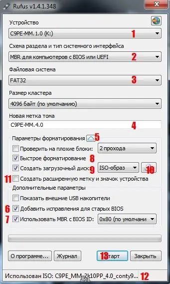 Для работы с C9PE необходимо создать загрузочный носитель. Диск можно записать на CD/DVD с помощью Nero Burning ROM или аналогичных программ, используя метод записи Disc-At-Once с финализацией. Для USB-носителей рекомендуется предварительное форматирование с помощью RMPrepUSB, HP USB Disk Storage Format Tool, BootICE или специализированных скриптов, таких как FlashFormat_2k10_FBinst. Важно, чтобы флешка была отформатирована под FAT32 или NTFS и распознавалась BIOS как USB-HDD. После форматирования на устройство копируются папка 2k10, EFI и файл P2Start.exe. Подключение загрузчика осуществляется через утилиту SetLDR-2k10, которая позволяет выбрать и установить BOOTMGR, Syslinux, Grub4Dos или XORBOOT. Альтернативно, можно использовать Rufus для быстрого создания загрузочной флешки с автоматической установкой загрузчика. Сборка также может быть установлена на жёсткий диск с выделением активного раздела под загрузочные файлы.