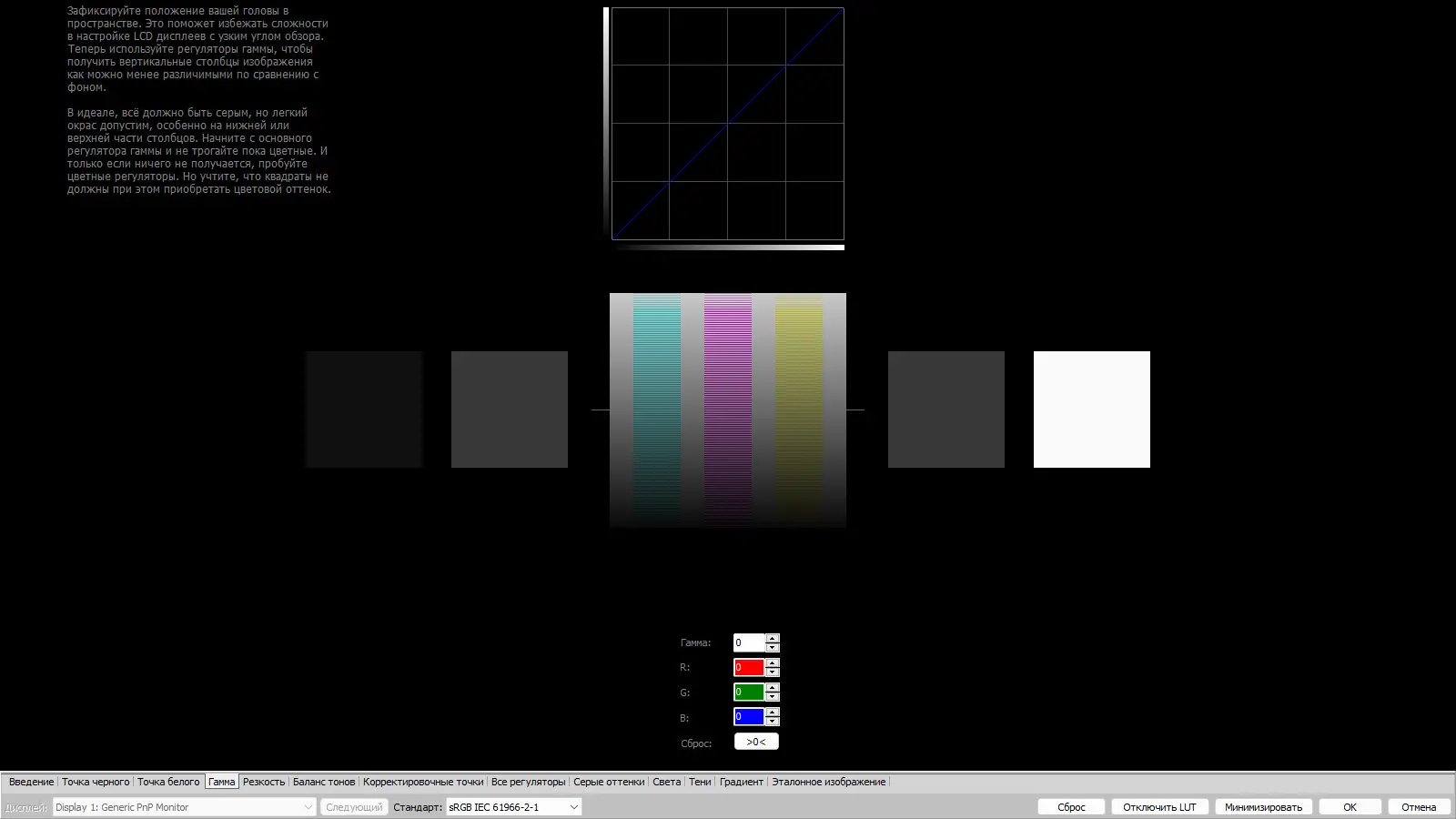 Использование программы начинается с запуска калибровочного режима, в котором пользователь видит тестовые изображения, состоящие из серых полос и градиентов. Основная задача — визуально определить момент, когда полосы сливются или будут выглядеть максимально однородно. На основе этих наблюдений программа вычисляет корректирующую кривую. Далее можно настроить точку черного, точку белого, баланс цветов и задать дополнительные корректировочные точки для уточнения результатов. После завершения калибровки кривая загружается в драйвер видеокарты через Lutloader, который автоматически восстанавливает настройки после пробуждения системы.