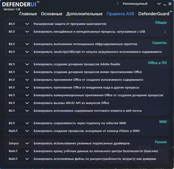 Работа с программой начинается с запуска исполняемого файла и автоматического подключения к службам безопасности Windows. Главное окно отображает текущий статус защиты, включая состояние брандмауэра, защиты от вредоносных программ и контроля учётных записей. Для изменения параметров достаточно перейти в нужный раздел и внести изменения с помощью переключателей или выпадающих списков. Как настроить профиль безопасности — объясняет встроенная подсказка, появляющаяся при наведении на элемент. Пользователь может выбрать один из четырёх предустановленных режимов: по умолчанию, рекомендуемый, интерактивный или агрессивный. Каждый из них оптимизирован под определённый уровень угроз и тип использования ПК. После выбора профиля все соответствующие параметры применяются мгновенно. Также доступна ручная настройка каждого компонента, включая поведенческий мониторинг, защиту от эксплойтов и проверку съёмных носителей.