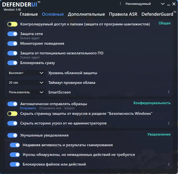 DefenderUI служит альтернативной графической оболочкой для управления компонентами безопасности в операционной системе Windows. В отличие от стандартного интерфейса Безопасность Windows, где параметры разбросаны по разным разделам, данная утилита консолидирует все настройки в одном окне. Это позволяет быстро вносить изменения без необходимости перехода в реестр или редактирования политик. Программа поддерживает полный контроль над защитой в реальном времени, сканированием, исключениями и обновлением сигнатур. Она free и не требует установки, работая в портативном режиме. Благодаря этому, пользователи могут запускать её с флешки или использовать на нескольких устройствах без лишней настройки. Утилита также выводит сообщения о состоянии защиты, предупреждая о возможных угрозах или отключённых модулях.