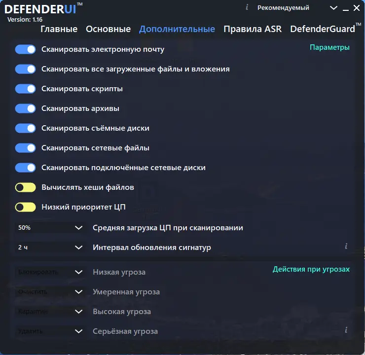 DefenderUI — это бесплатная утилита с интуитивным интерфейсом, предназначенная для расширенной настройки встроенного антивируса Windows. Программа упрощает доступ к скрытым параметрам Microsoft Defender и позволяет быстро изменять режимы защиты. Она подходит как новичкам, так и продвинутым пользователям, желающим получить полный контроль над безопасностью системы.