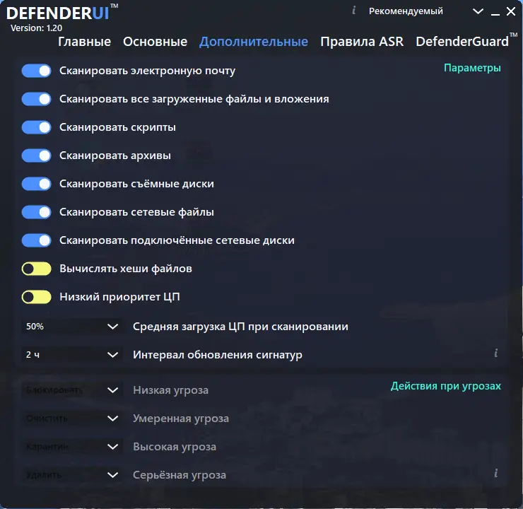 DefenderUI — это бесплатная утилита, которая служит альтернативной графической оболочкой для настройки встроенного антивируса Windows. Программа предоставляет расширенный доступ ко всем параметрам Microsoft Defender, упрощая процесс настройки и раскрывая скрытые возможности защиты системы.