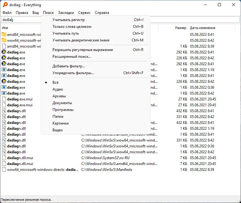 Everything — это утилита для Windows, обеспечивающая мгновенный поиск файлов и папок по имени без индексирования содержимого. Программа отображает полную структуру дисков в реальном времени, фильтруя результаты по мере ввода запроса. Лёгкая в использовании и минимально нагружающая систему, она идеально подходит для быстрой навигации по файловой системе.