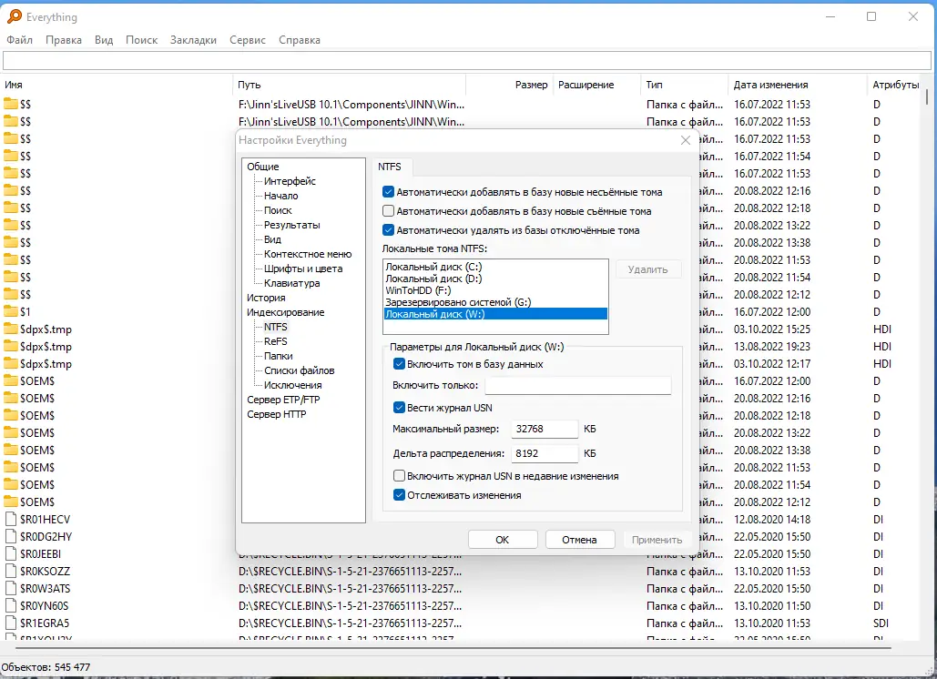 - Автоматическое индексирование всех указанных дисков и папок с обновлением базы в фоне