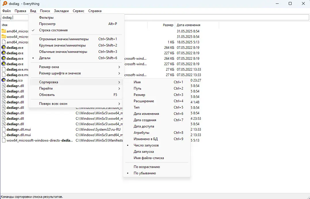 - Возможность сортировки результатов по имени, размеру, дате создания и другим параметрам