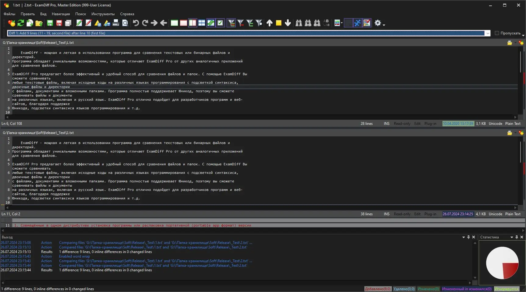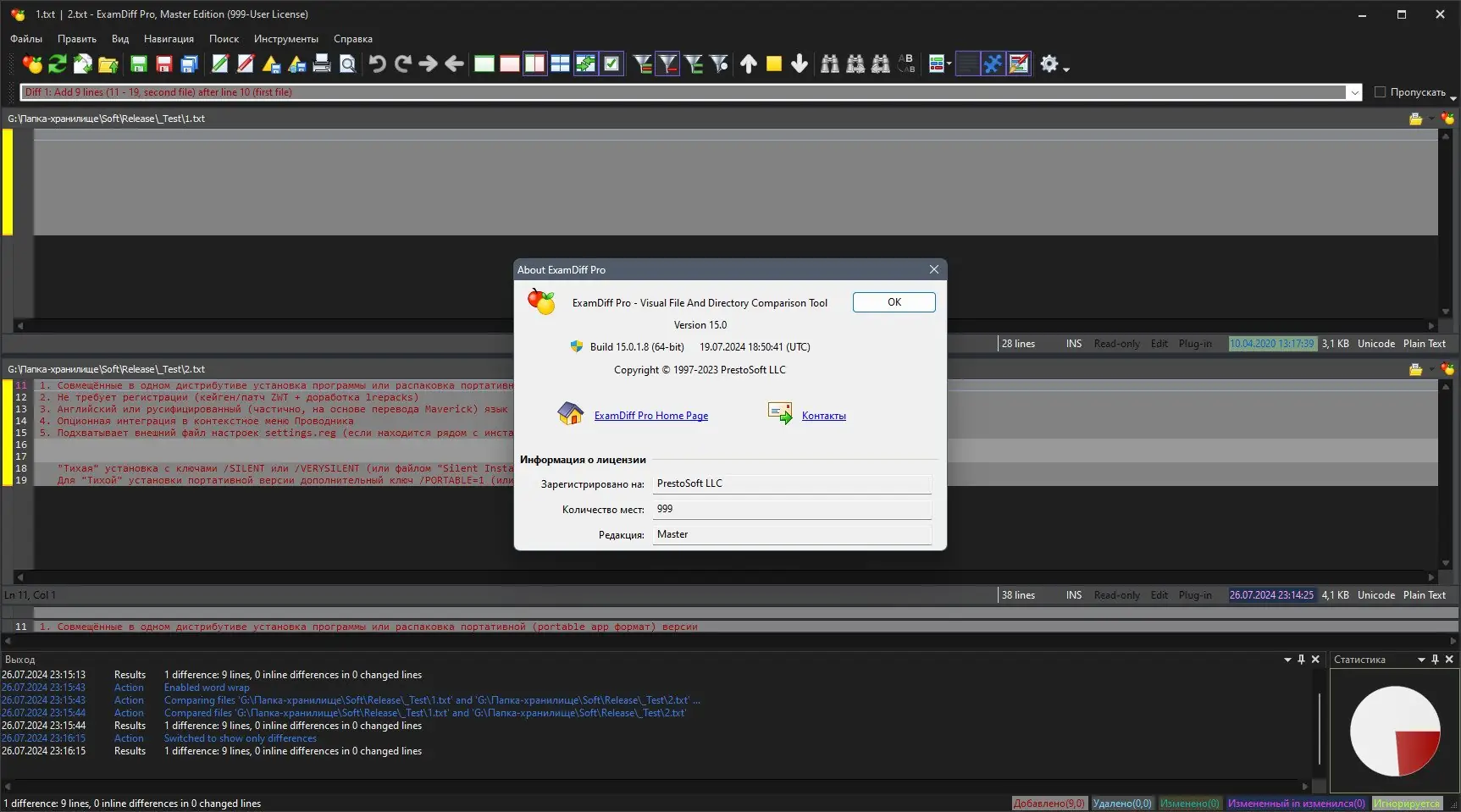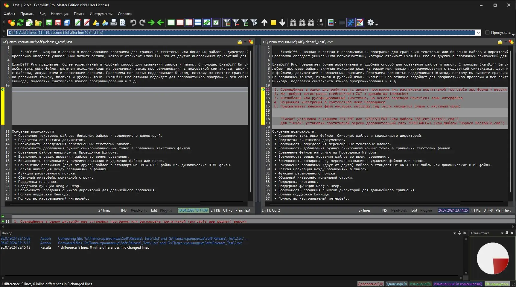 ExamDiff — это надёжное решение для тех, кто регулярно работает с текстовыми данными и требует точности в выявлении изменений. Версия pro включает расширенный набор инструментов, таких как поддержка плагинов, экспорт в HTML и интеграция с системой. Программа совместима с современными версиями Windows и может использоваться как в стационарном, так и в портативном режиме. Установка не требует лицензирования, а наличие русского интерфейса делает её доступной для широкой аудитории.
