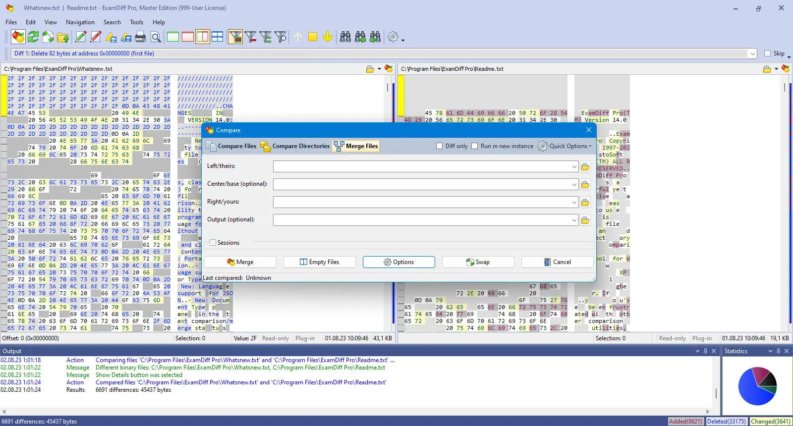 ExamDiff — это инструмент для точного и быстрого сравнения текстовых и бинарных файлов, а также содержимого каталогов, разработанный с учётом потребностей программистов и системных администраторов. Программа сочетает в себе высокую производительность, поддержку современных стандартов кодирования и удобный интерфейс. Подходит для анализа изменений в исходных кодах, конфигурационных файлах и любых других типах данных.