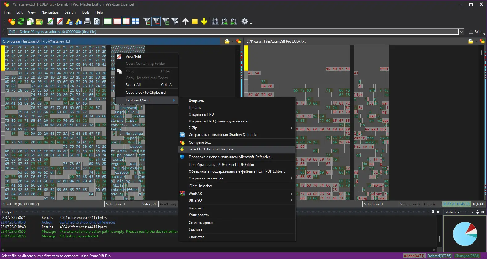 Работа с программой начинается с выбора двух файлов или директорий для сравнения. Пользователь может открыть их через главное меню, перетащить с помощью Drag & Drop или вызвать функцию прямо из Проводника. После загрузки данных ExamDiff отображает различия в виде цветовых выделений, позволяя быстро находить добавленные, удалённые или изменённые строки.