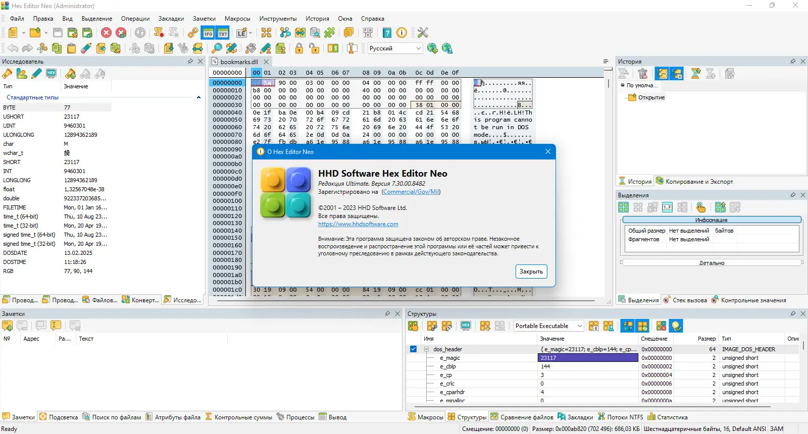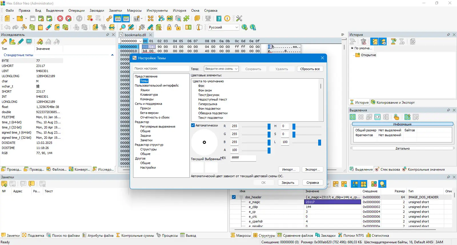 Hex Editor Neo — это профессиональный инструмент для работы с шестнадцатеричными и бинарными файлами в операционных системах Windows. Программа обеспечивает высокую скорость обработки данных, поддерживает файлы огромного объёма и предлагает широкий набор функций для анализа, редактирования и отладки бинарной информации. Интерфейс отличается гибкостью, а встроенные инструменты позволяют эффективно управлять данными на уровне отдельных байтов.