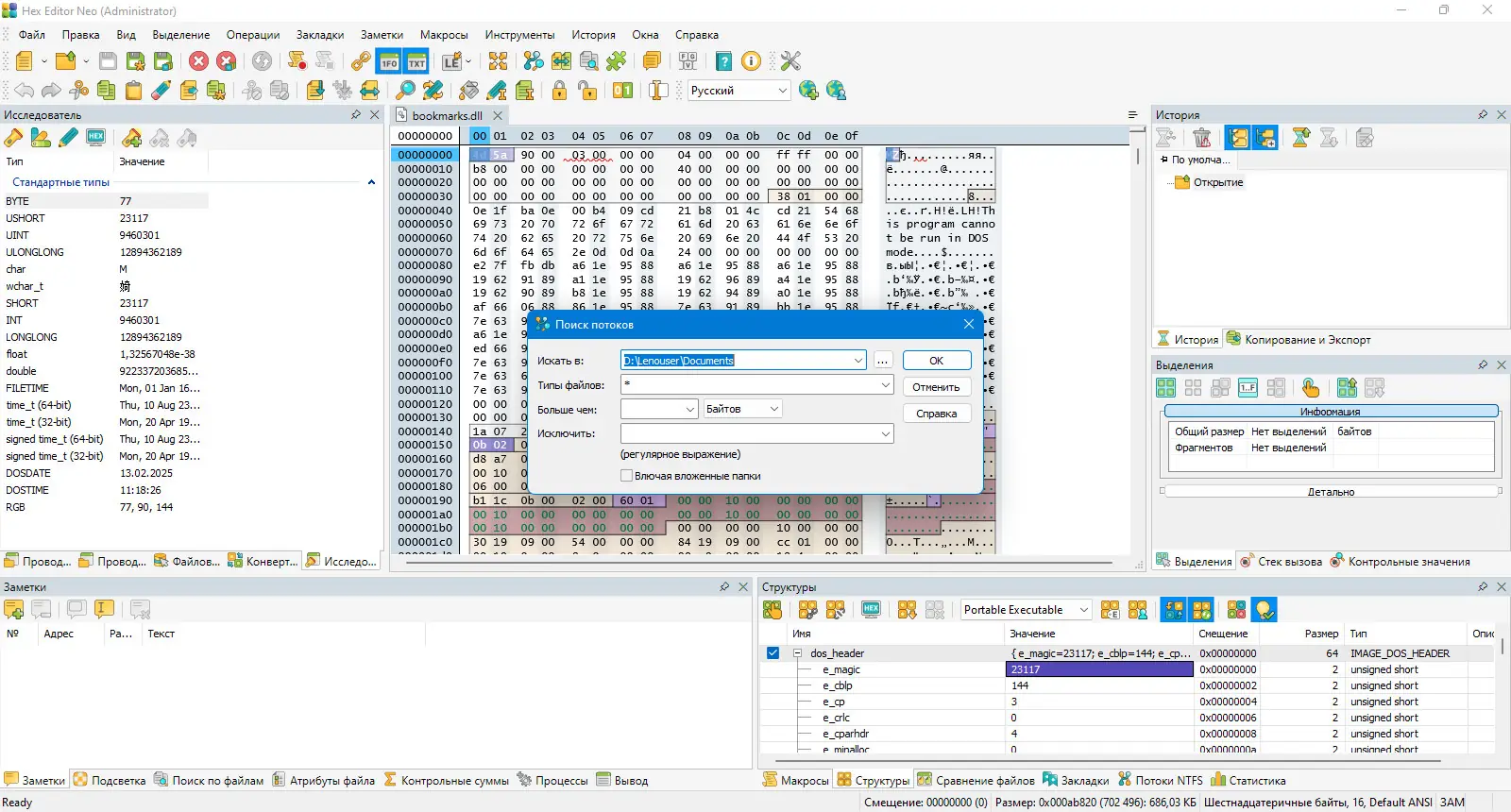 Работа с программой начинается с открытия файла через меню или перетаскивание в окно редактора. После загрузки данные отображаются в виде шестнадцатеричного кода с возможностью синхронного просмотра в текстовом виде. Пользователь может выделить нужный участок, применить операции редактирования, выполнить поиск по шаблону или сохранить изменения в исходный файл или новый. Все действия фиксируются в истории, которую можно сохранить и загрузить позже для анализа или восстановления.
