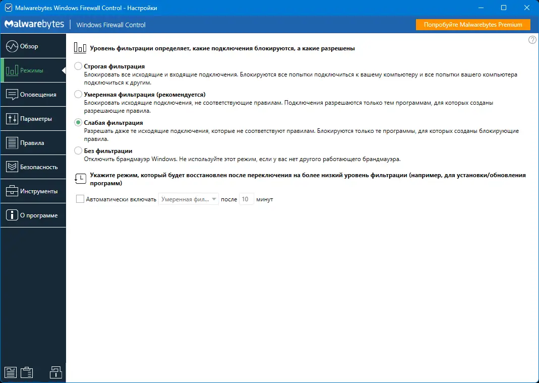 - Поддерживает несколько режимов фильтрации: от полной блокировки до полного отключения контроля.