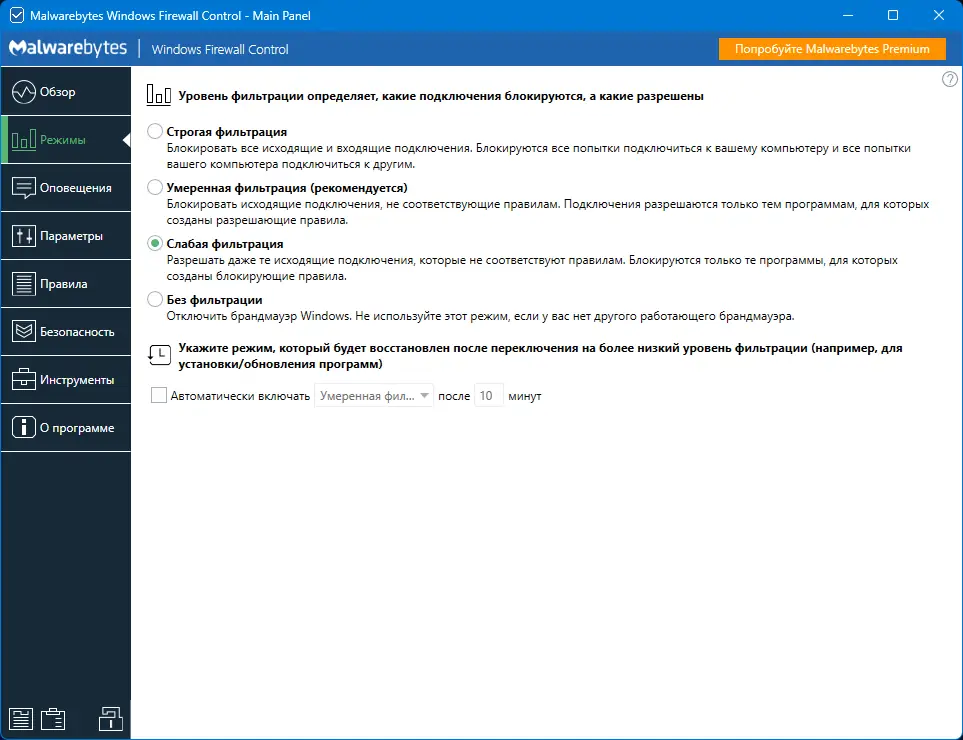 Malwarebytes Firewall Control расширяет функциональность стандартного брандмауэра Windows, предоставляя пользователю прямой и быстрый доступ к его ключевым параметрам через контекстное меню системного трея. Утилита поддерживает несколько режимов фильтрации, что позволяет гибко настраивать уровень сетевой безопасности в зависимости от текущих потребностей. Работа в режиме высокой фильтрации блокирует все соединения по умолчанию, в то время как средний и низкий режимы дают возможность контролировать только исходящий трафик, обеспечивая баланс между безопасностью и удобством.