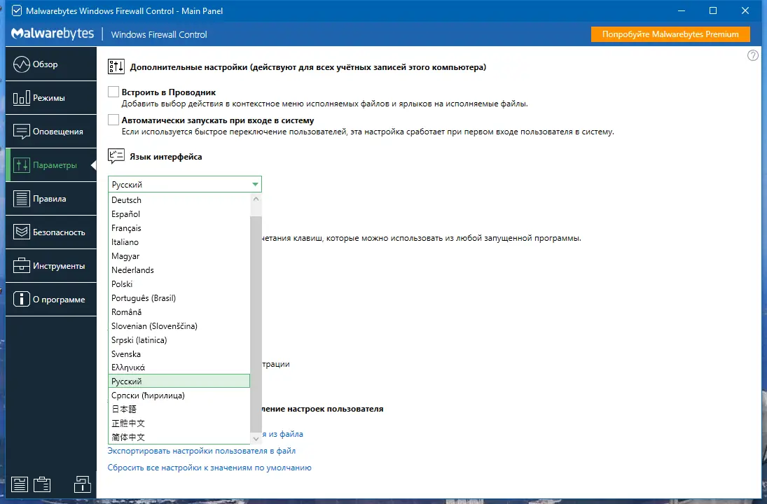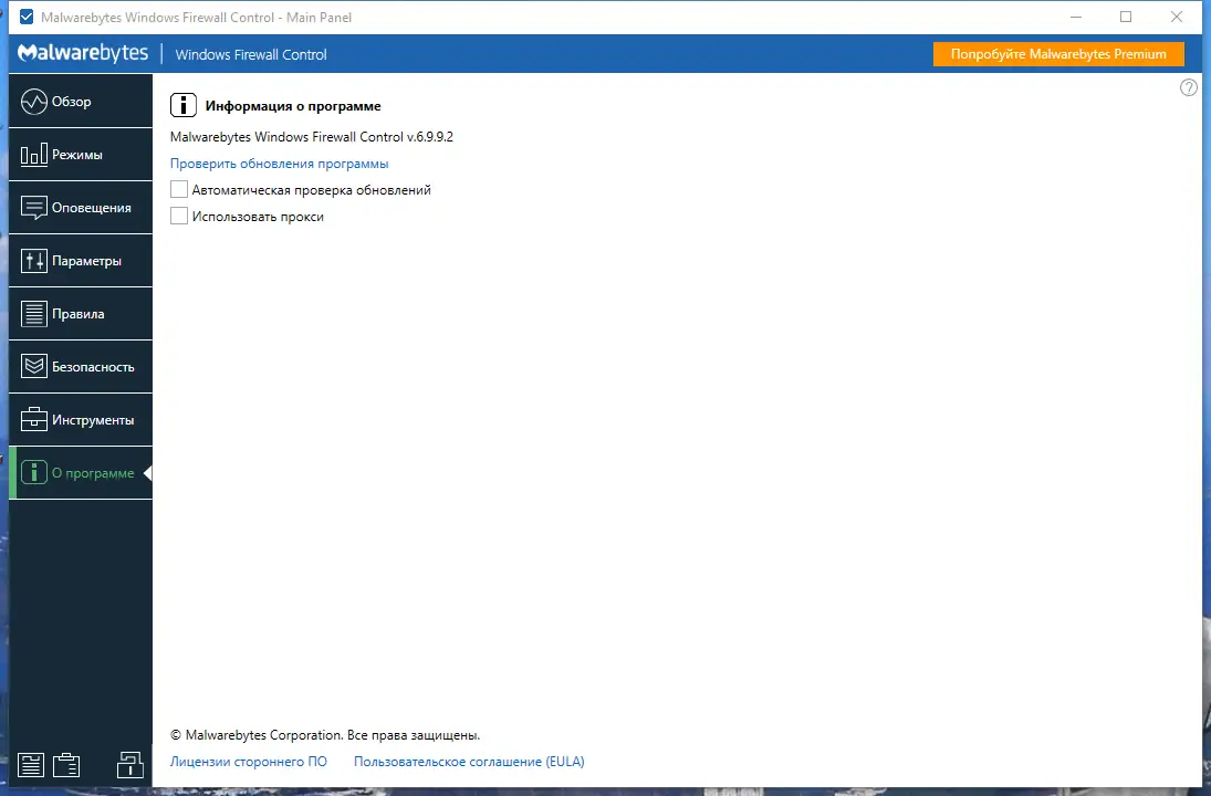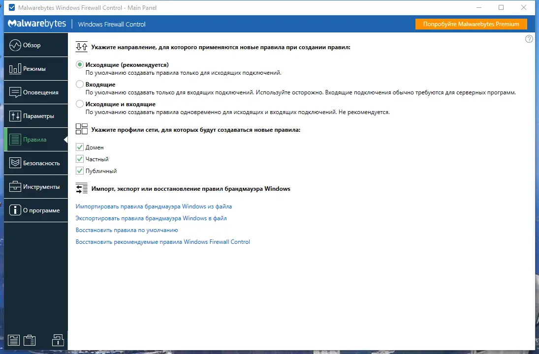 Работа с Malwarebytes Firewall Control