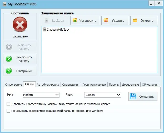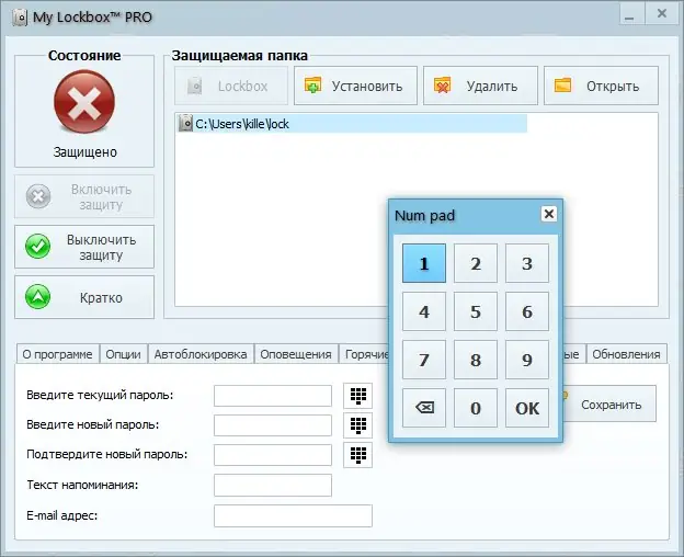 Установка и настройка My Lockbox не требуют специальных знаний. После запуска установочного файла пользователь указывает папку, которую необходимо защитить, и задаёт пароль. Дополнительно требуется внести изменения в реестр с помощью файла My Lockbox.reg, что активирует полную блокировку. После этого защищённая директория становится невидимой для всех приложений и пользователей. Для доступа к содержимому достаточно запустить программу и ввести пароль. Интерфейс позволяет в любой момент изменить местоположение защищённой папки, обновить пароль или временно отключить защиту.