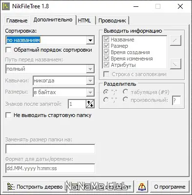 - Гибкие настройки вывода: размеры, даты создания и изменения, атрибуты файлов и папок