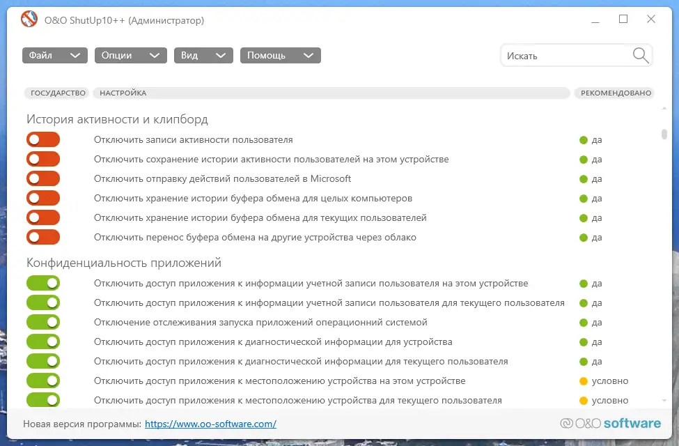 O&O ShutUp10 — это бесплатное приложение для настройки параметров конфиденциальности в операционной системе Windows 10 и выше. Программа помогает отключить нежелательные функции, связанные с передачей данных, автоматическими обновлениями и сбором персональной информации, позволяя пользователю сохранить контроль над своей системой и личными данными. Интерфейс интуитивно понятен и не требует специальных знаний.