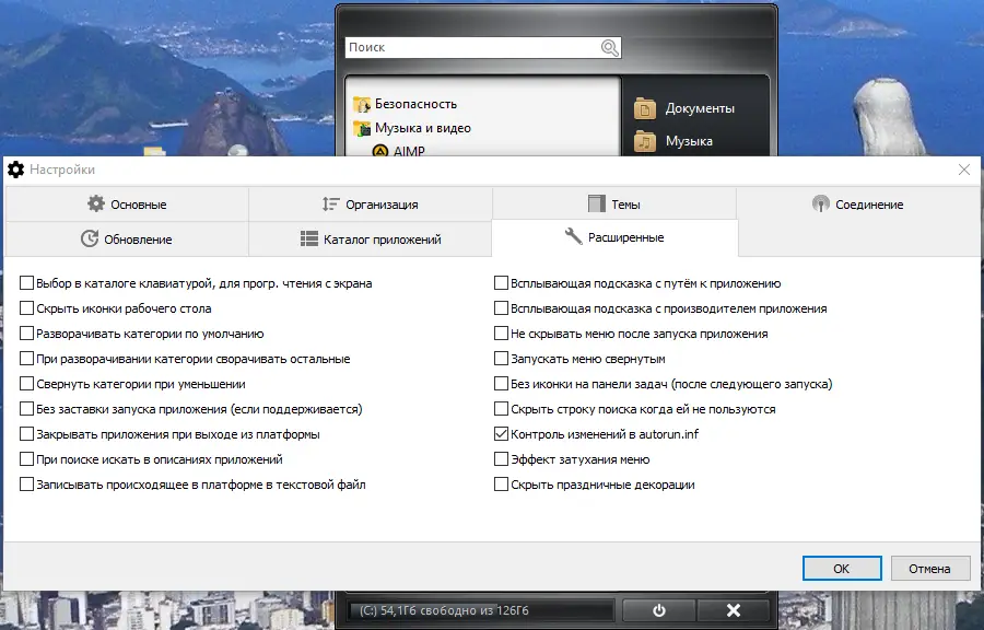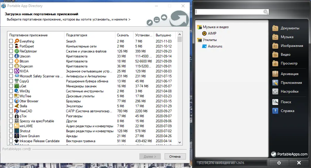 После распаковки платформы на съемный носитель или в папку на диске, достаточно запустить главный исполняемый файл. При первом запуске открывается меню с предустановленными приложениями от разработчика — можно выбрать нужные, отметив галочками, и начать их загрузку. Платформа автоматически скачает, распакует и интегрирует программы в общее меню. Добавление собственных портативных приложений выполняется вручную через папку с данными. Пользователь может создавать папки, настраивать категории, выделять избранные приложения и включать быстрый поиск. Меню поддерживает автозапуск определенных программ, фильтрацию по типу и скрытие splash-экранов. В любой момент можно изменить оформление, выбрав одну из встроенных тем или загрузив собственное фоновое изображение.