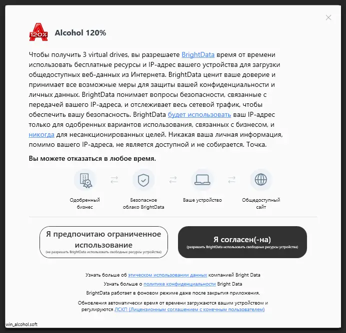 Alcohol 120% Free Edition 2.1.1 Build 2201 доступна для загрузки в полном объёме. Обновлённая версия включает исправления ошибок и улучшения стабильности работы. Программа полностью бесплатна для личного использования, но требует внимательного подхода при установке. В процессе инсталляции необходимо выбрать режим ограниченного использования, чтобы активировать бесплатную лицензию. Поддержка современных операционных систем позволяет запускать программу на компьютерах с Windows 7, 8.1, 10 и 11 разрядности x86 и x64.
