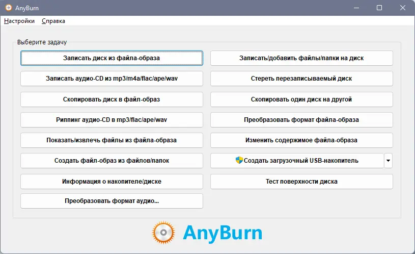 AnyBurn — это компактная и бесплатная утилита для записи, копирования и создания образов дисков, поддерживающая работу с CD, DVD и Blu-ray. Программа предлагает интуитивный интерфейс и широкий набор функций, необходимых для повседневной работы с оптическими носителями, включая создание загрузочных носителей и риппинг аудио.