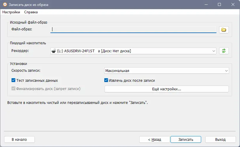 - Быстрая и стабильная запись дисков с минимальным потреблением ресурсов.