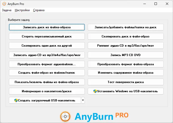AnyBurn — компактная и функциональная утилита для записи, копирования и создания образов дисков. Программа поддерживает широкий спектр операций с CD, DVD и Blu-ray, включая запись аудиодисков, создание загрузочных носителей и конвертацию образов. Она работает быстро, не нагружает систему и подходит как новичкам, так и опытным пользователям.