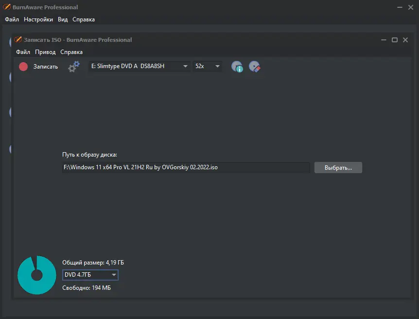 - Возможность создания и записи образов дисков формата ISO, CUE/BIN и других.