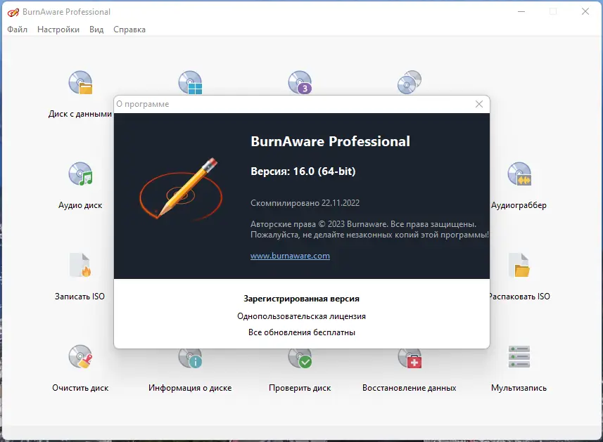 BurnAware — это универсальное программное обеспечение для записи, копирования и работы с образами дисков различных типов, включая CD, DVD, Blu-Ray и HD-DVD. Программа сочетает в себе простоту интерфейса и мощный функционал, позволяя пользователям выполнять широкий спектр задач, связанных с оптическими носителями.