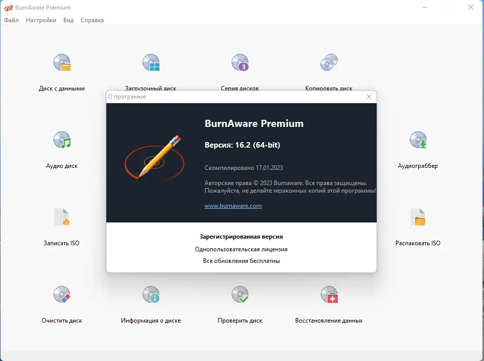 BurnAware — это универсальное программное обеспечение для записи, копирования и работы с образами дисков различных форматов. Поддержка CD, DVD, Blu-Ray и HD-DVD, а также инструменты для создания, копирования и прожига образов делают её незаменимой для пользователей, которым требуется надежное решение в сфере оптических носителей.