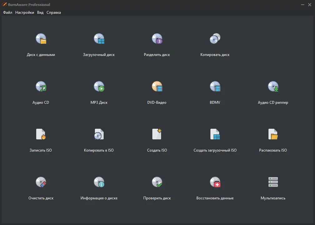 BurnAware — это универсальное приложение для записи, копирования и работы с образами дисков, поддерживаемое на всех актуальных версиях Windows. Программа одинаково эффективно справляется как с созданием резервных копий, так и с подготовкой загрузочных носителей. Она поддерживает широкий спектр форматов и типов дисков, включая CD, DVD, Blu-Ray и HD-DVD.