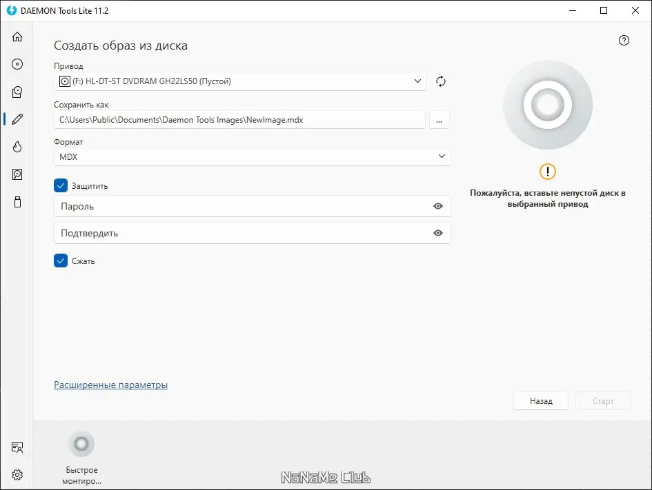 - Создание образов с физических носителей в форматах ISO, MDS, MDX
