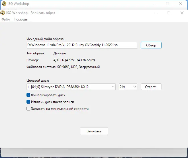 - Возможность записи как ISO, так и CUE-файлов на физические носители.