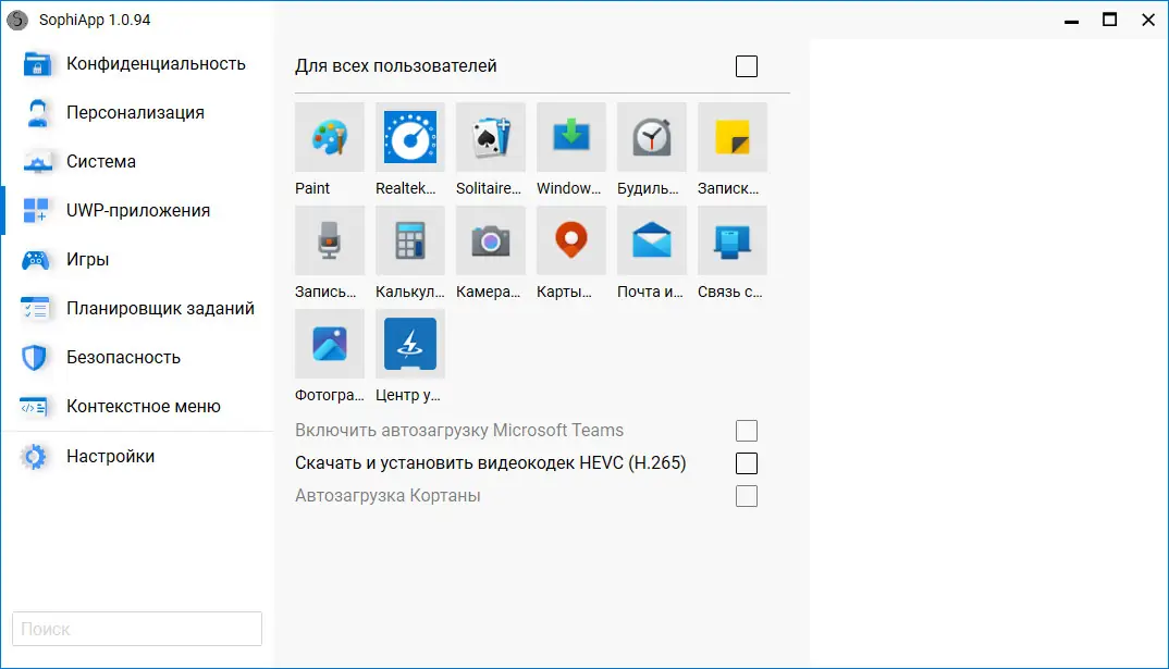 - Программа поддерживает настройку конфиденциальности, телеметрии, пользовательского интерфейса и безопасности.