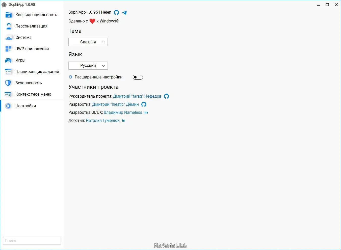 SophiApp — это современный графический инструмент для тонкой настройки Windows 10 и Windows 11, созданный как логическое продолжение популярного скрипта Sophia Script. Программа полностью бесплатна, имеет открытый исходный код и позволяет настраивать операционную систему без риска повреждения её структуры. Все изменения вносятся с использованием официально поддерживаемых методов, что гарантирует стабильность и безопасность системы.