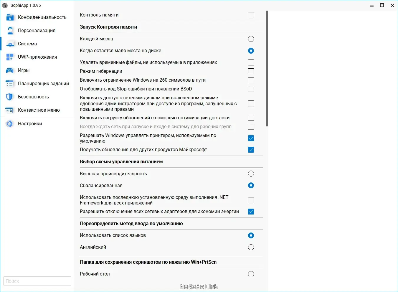 SophiApp представляет собой мощный твикер, ориентированный на пользователей, стремящихся получить полный контроль над своими настройками Windows. Он позволяет изменять параметры конфиденциальности, отключать телеметрию, управлять UWP-приложениями, настраивать проводник и контекстное меню, а также оптимизировать систему через встроенные механизмы ОС. Интерфейс приложения разработан с учётом современных подходов к пользовательскому опыту, обеспечивая интуитивное и быстрое взаимодействие.