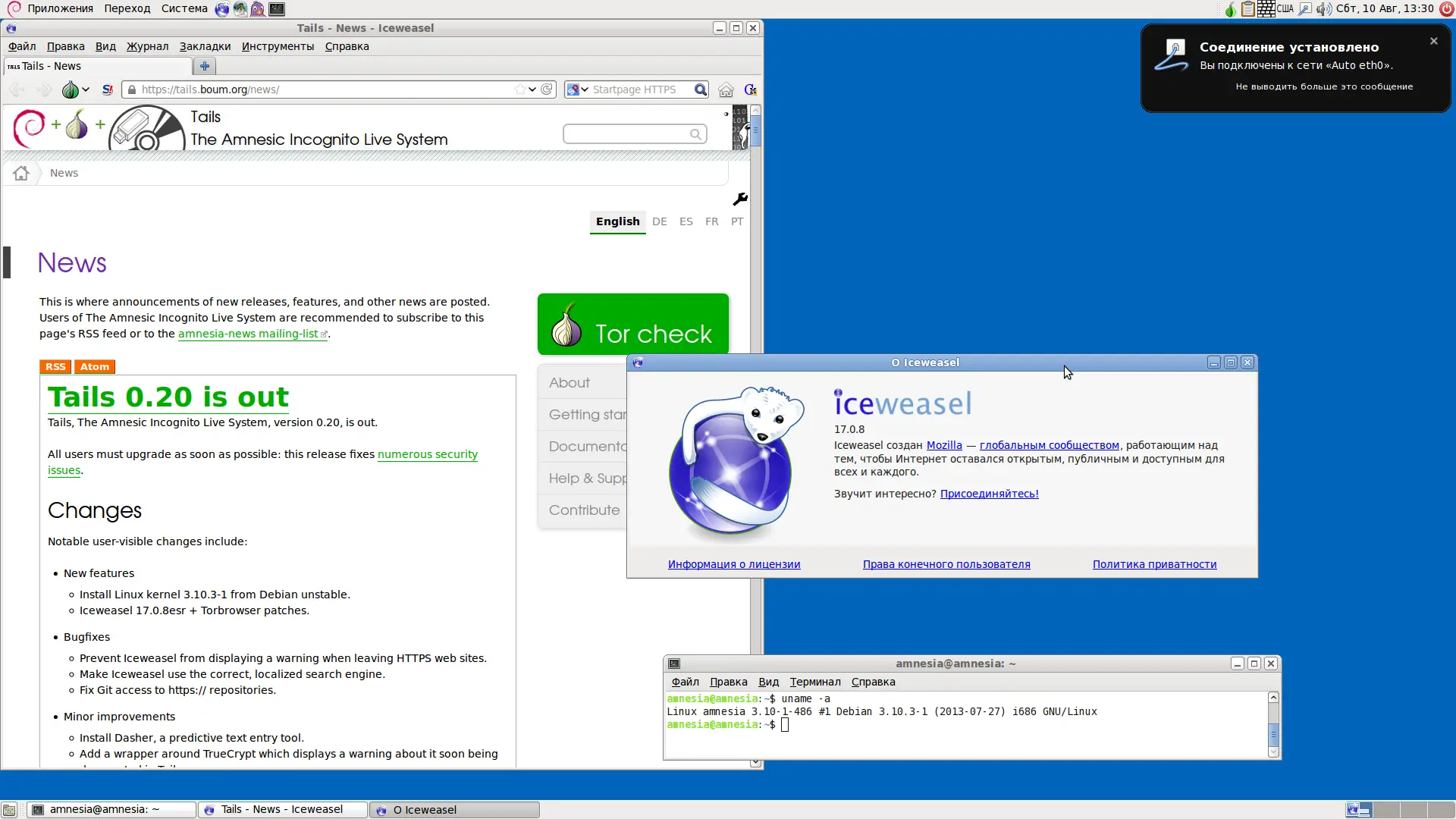 - Анонимный веб-серфинг с предустановленным Tor Browser на базе Firefox 24.4.0esr с патчами безопасности.