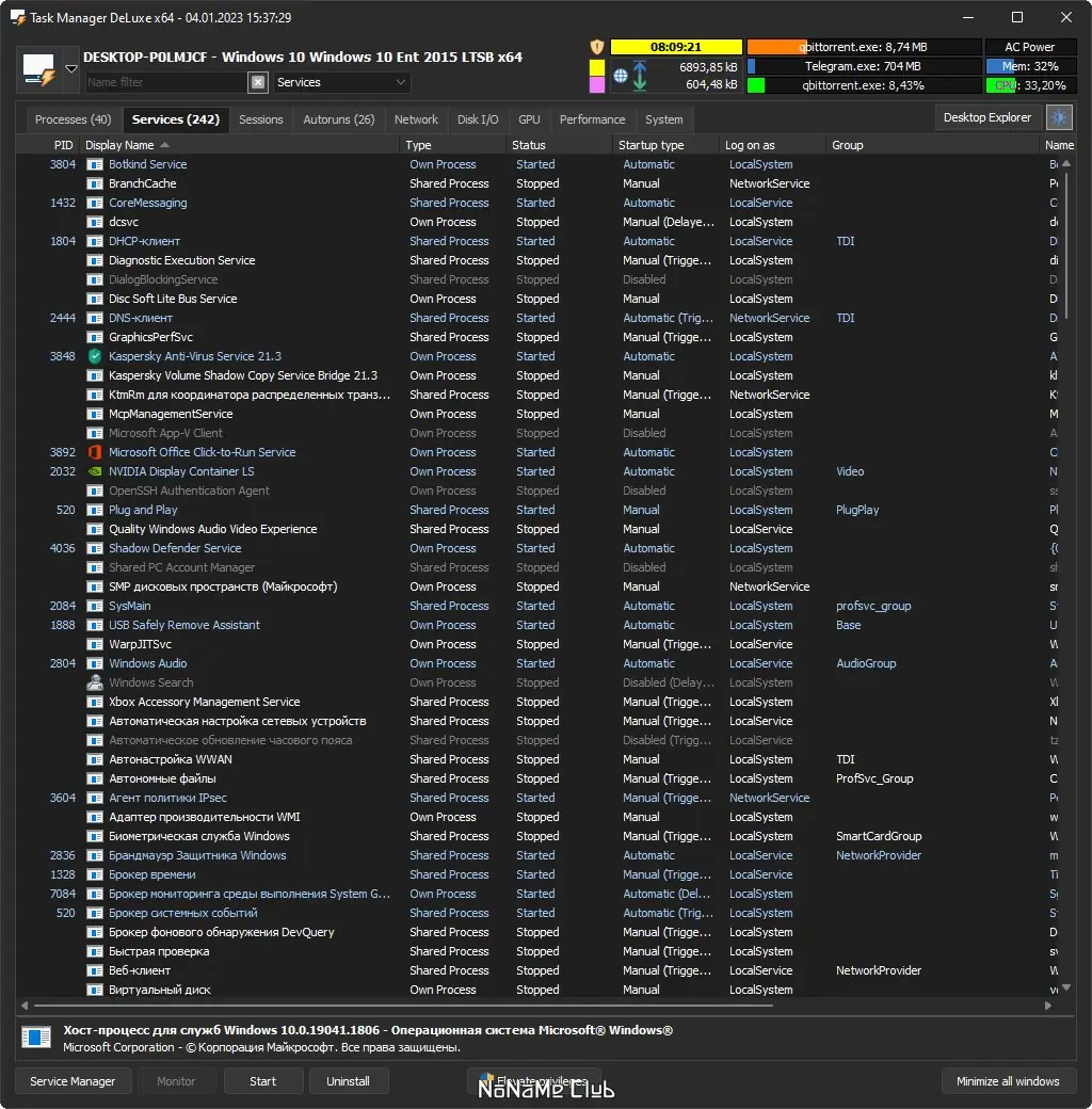 - Контроль служб Windows с возможностью остановки, перезапуска и управления зависимыми компонентами
