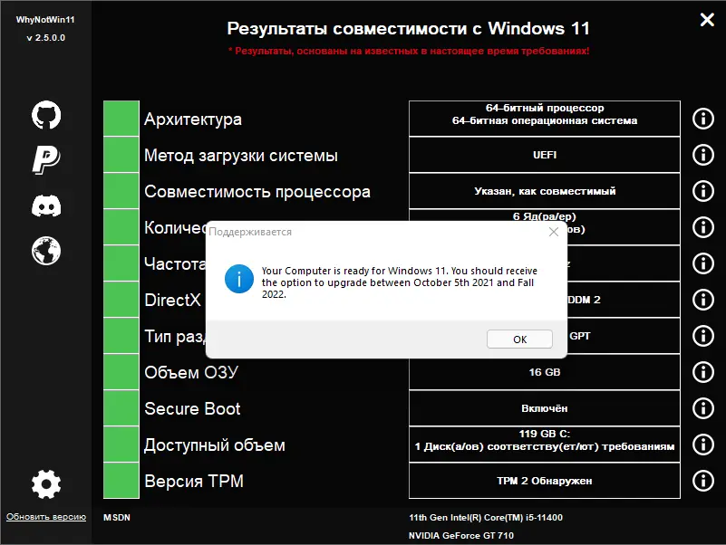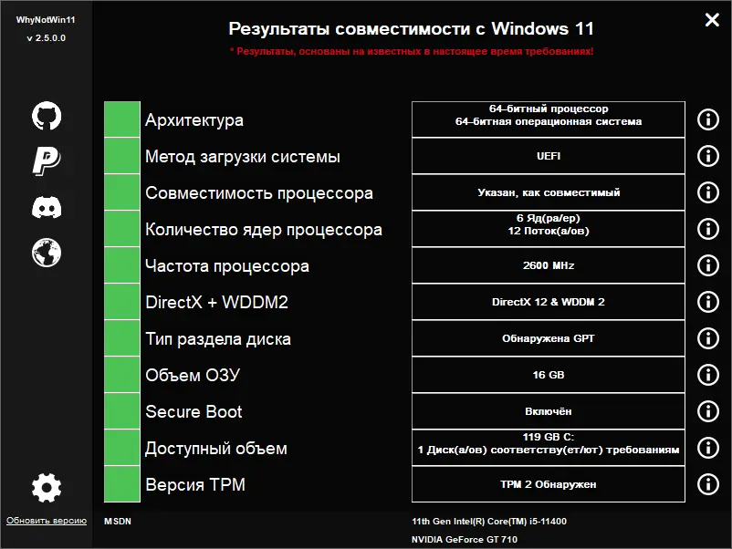 - Определяет соответствие устройства официальным требованиям Microsoft к Windows 11