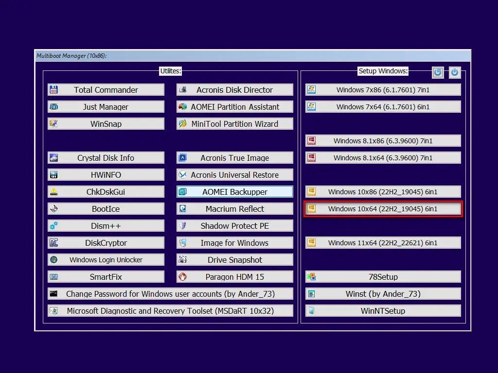 Multiboot Collection — это универсальный мультизагрузочный сборник, объединяющий инструменты для установки, восстановления и диагностики операционных систем. На одном носителе доступны образы Windows 7–11, среды WinPE, утилиты для работы с дисками, драйверы и программы для автоматической установки. Поддерживается загрузка в режимах Legacy BIOS и UEFI, включая совместимость с Secure Boot. Сборка легко модифицируется: компоненты можно добавлять, обновлять или удалять без потери работоспособности остальных элементов.