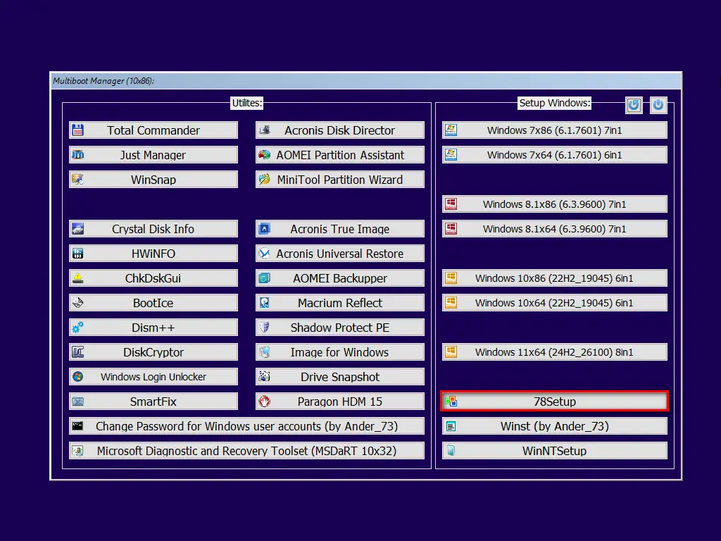 Multiboot Collection — многофункциональный мультизагрузочный сборник, объединяющий установку операционных систем, восстановление данных, диагностику оборудования и автоматическую инсталляцию драйверов и программ. Поддерживает современные режимы загрузки, включая UEFI и Legacy BIOS, и работает с флешками от 32 ГБ. Сборка организована модульно: каждый компонент легко заменить, обновить или удалить без потери работоспособности остальных частей. Идеально подходит для IT-специалистов, системных администраторов и пользователей, которым нужен универсальный инструмент в одной флешке.